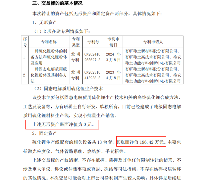 據有研新材料股份有限公司(以下簡稱“有研新材”)2025年6月25日披露的相關公告,本次轉讓的資產包括無形資產和固定資產兩部分,包含兩項在途專利、固態電解質用硫化鋰生產技術、硫化鋰生產線配套的相關設備共13臺套,其中無形資產賬面凈值為0元,固定資產賬面凈值為196.42萬元。