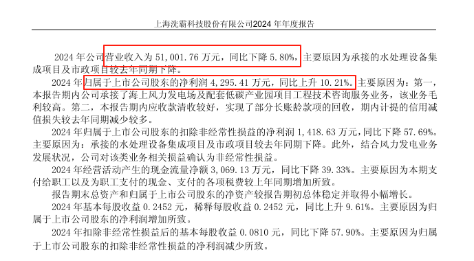 據公司年報,2024年上海洗霸營業收入為51,001.76萬元,同比下降5.80%;凈利潤為4,295.41萬元,同比上升10.21%。營業收入下降主要系當期承接的水處理設備集成項目及市政項目較去年同期下降。