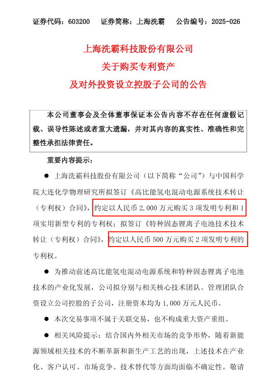 今年5月,上海洗霸曾公告擬與中國科學院大連化學物理研究所簽訂《高比能氫電混動電源系統技術轉讓(專利權)合同》及《特種固態鋰離子電池技術技術轉讓(專利權)合同》,擬購買專利資產共計2,500萬元并投資設立控股子公司。