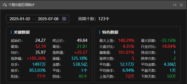 今年以來,受固態電池概念影響,上海洗霸股價震蕩上行。同花順區間統計數據顯示,自2025年1月2日至今,公司股價漲幅達105.36%,上漲天數達72天,其間共漲停5次。7月8日,上海洗霸股價低開后震蕩調整,以49.84元/股收盤,當日跌幅2.24%。