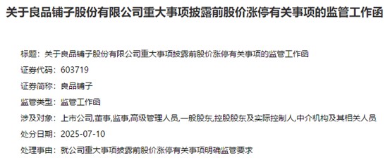 同一天,良品鋪子收到了來自上交所的監管工作函。處理事由為就公司重大事項披露前股價漲停有關事項明確監管要求,涉及對象包括上市公司、董事、監事、高級管理人員、一般股東、控股股東及實際控制人、中介機構及其相關人員。