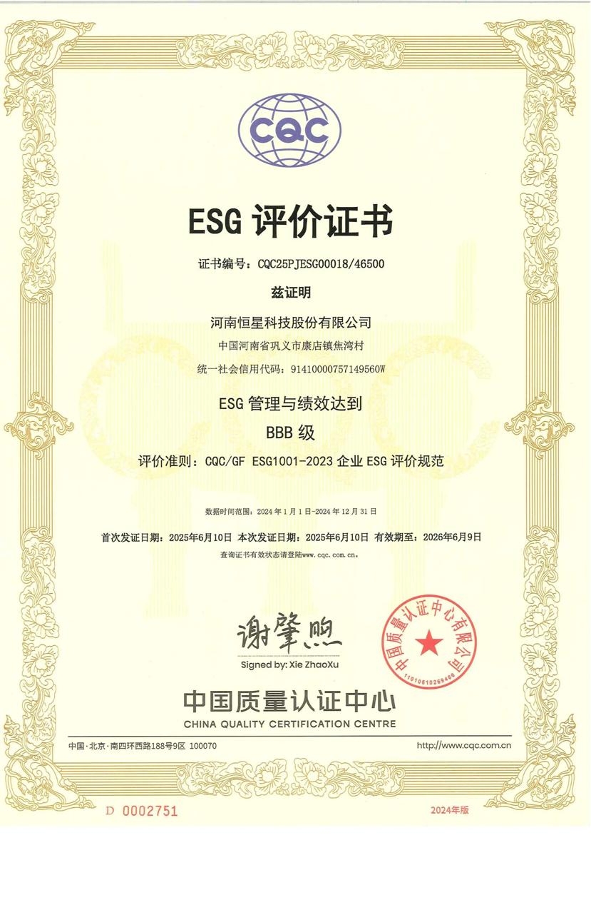 近日,河南恒星科技股份有限公司順利拿到中國質量認證中心ESG評價證書,依據《CQC/GF ESG1001-2023企業ESG評價規范》,恒星科技ESG管理與績效達到BBB級。