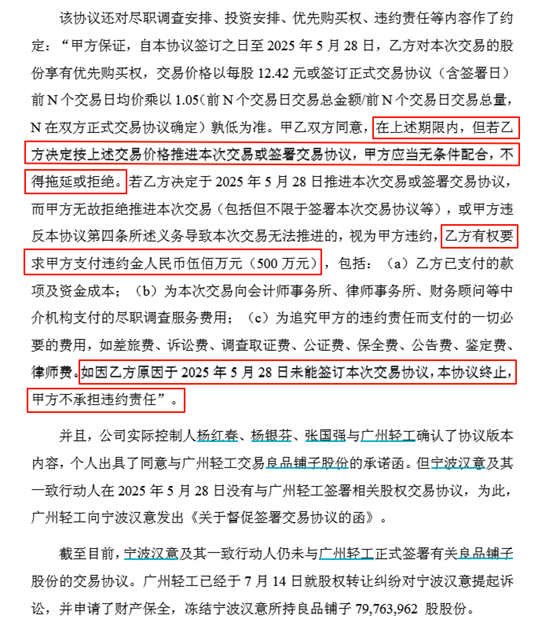 需要注意的是,按照寧波漢意與廣州輕工的約定,如果因為廣州輕工的原因,導致2025年5月28日未能簽訂本次交易協議,本協議終止,寧波漢意無需承擔違約責任。