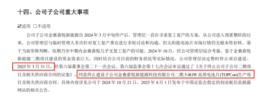 公開資料顯示,嘉悅新能源一期電池項目已從2024年3月14日開始停產(chǎn),預計短期內(nèi)無法恢復正常生產(chǎn)。同時,由于金寨嘉悅新能源二期項目建設的資金需求巨大,繼續(xù)投資會增加公司的風險敞口,公司管理層決定暫時停止該項目建設。2025年3月31日,嘉悅新能源二期(TOPCon)電池生產(chǎn)項目終止。