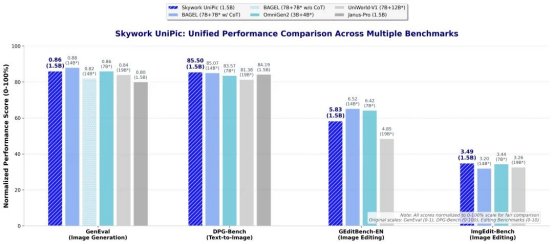 參數(shù)效率優(yōu)勢顯著:相比同類大參數(shù)統(tǒng)一模型(如BAGEL的14B總參數(shù)、UniWorld-V1的19B總參數(shù)),Skywork UniPic以1.5B的輕量級規(guī)模實現(xiàn)了接近甚至超越大參數(shù)模型的性能表現(xiàn);