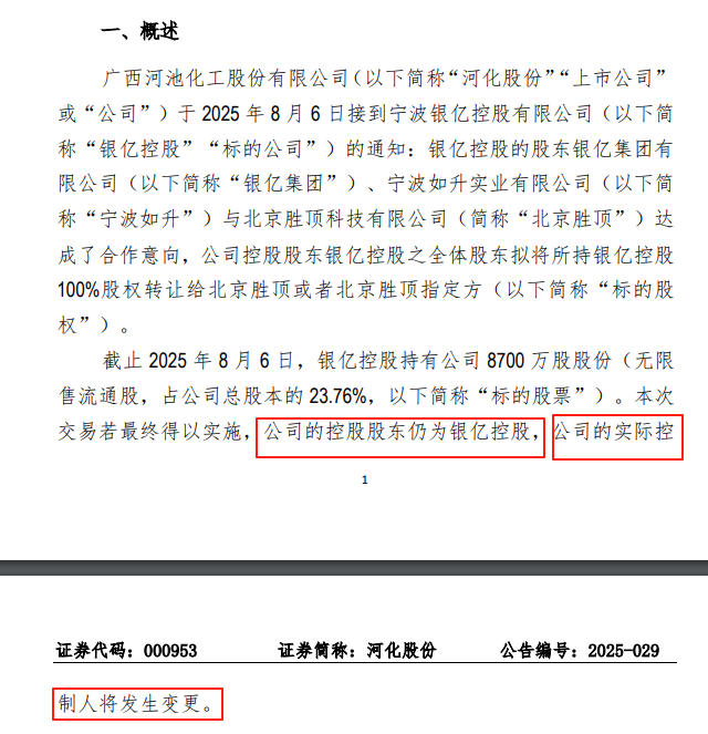 近日,河化股份(000953)披露了一系列關(guān)于控股股東寧波銀億控股有限公司(以下簡稱“銀億控股”)擬變更控制權(quán)的公告。8月6日晚間,河化股份公告稱,公司控股股東銀億控股之全體股東擬將所持銀億控股100%股權(quán)轉(zhuǎn)讓給北京勝頂科技有限公司(以下簡稱“北京勝頂”)或者北京勝頂指定方。本次交易若最終得以實(shí)施,公司的控股股東仍為銀億控股,公司的實(shí)際控制人將發(fā)生變更。
