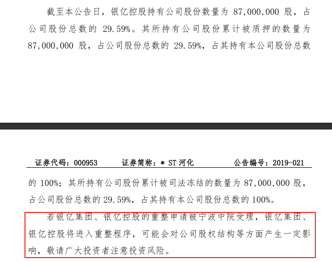 河化股份在2019年6月18日披露的提示性公告顯示,控股股東母公司銀億集團(tuán)、控股股東銀億控股持續(xù)面臨流動性危機(jī),若其進(jìn)入重整程序,可能會對公司股權(quán)結(jié)構(gòu)等方面產(chǎn)生一定影響。