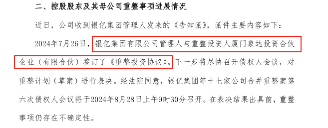 此前,廈門象嶼集團(tuán)有限公司參與銀億集團(tuán)重整計(jì)劃。據(jù)河化股份2024年7月30日公告,銀億集團(tuán)有限公司管理人與重整投資人廈門象達(dá)投資合伙企業(yè)(有限合伙)簽訂了《重整投資協(xié)議》。據(jù)企查查查詢到的信息顯示,廈門象達(dá)其出資人主要是廈門象嶼資產(chǎn)管理運(yùn)營有限公司(以下簡稱“象嶼資產(chǎn)”),象嶼資產(chǎn)為象嶼集團(tuán)下屬企業(yè)廈門象嶼金象控股集團(tuán)有限公司(以下簡稱“象嶼金象”)的全資子公司。業(yè)內(nèi)人士認(rèn)為,廈門象嶼作為世界500強(qiáng)國企,成為銀億集團(tuán)的主要重整投資人,將為銀億企業(yè)的戰(zhàn)略發(fā)展提供根本性的保障。