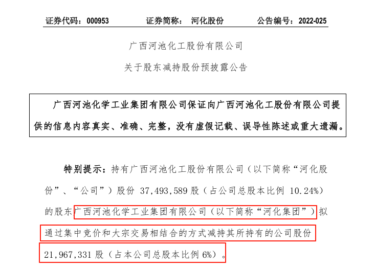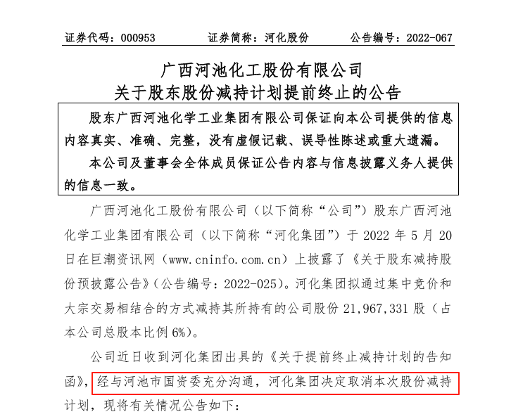 河化股份2022年5月25日晚間公告顯示,河池市國資委向上市公司發(fā)出一份《關(guān)于要求公開披露河化集團(tuán)減持股份爭議事項(xiàng)的函》,河池市委認(rèn)為河化集團(tuán)的公告隱瞞了重要的承諾事項(xiàng),本次減持違反了河池市國資委與河化集團(tuán)的上級單位關(guān)于不得減持公司股份的相關(guān)約定,要求公司對河池市國資委提出的異議信息予以披露。
