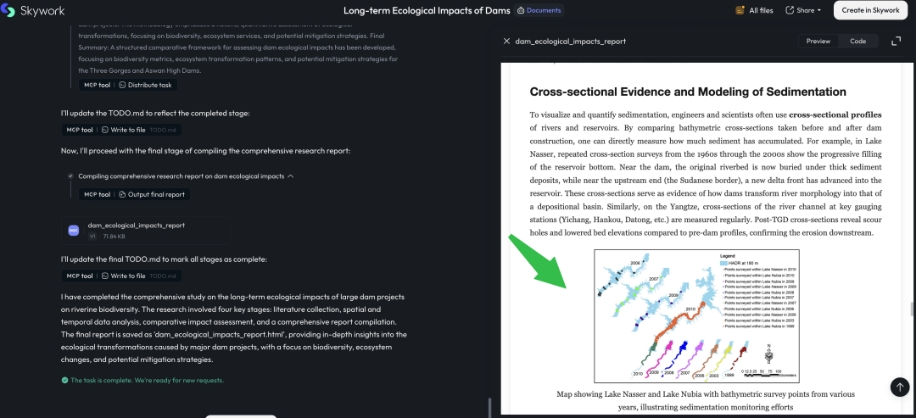 在對圖片做了收集和理解之后,天工超級智能體(Skywork Super Agents)在生成文檔時,會充分利用圖片中的信息,Agent會在恰當的位置直接將高質量圖片作為交付物中的配圖(下圖綠色箭頭處),更直接地傳達信息并顯著降低讀者的理解成本: