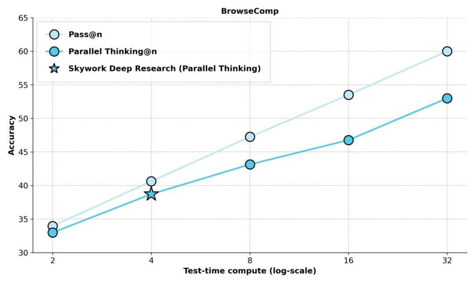 更值得一提的是,在并行思考模式下,Skywork Deep Research的正確率會隨著思考時間的增加而持續攀升,這充分展現了自研系統架構的卓越潛力與強大擴展性。