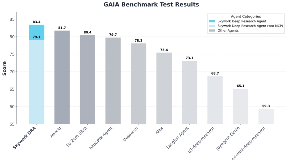 另一方面,Skywork Deep Research Agent在GAIA Test基準上同樣取得了SOTA表現,充分驗證了其在復雜任務中的綜合實力。