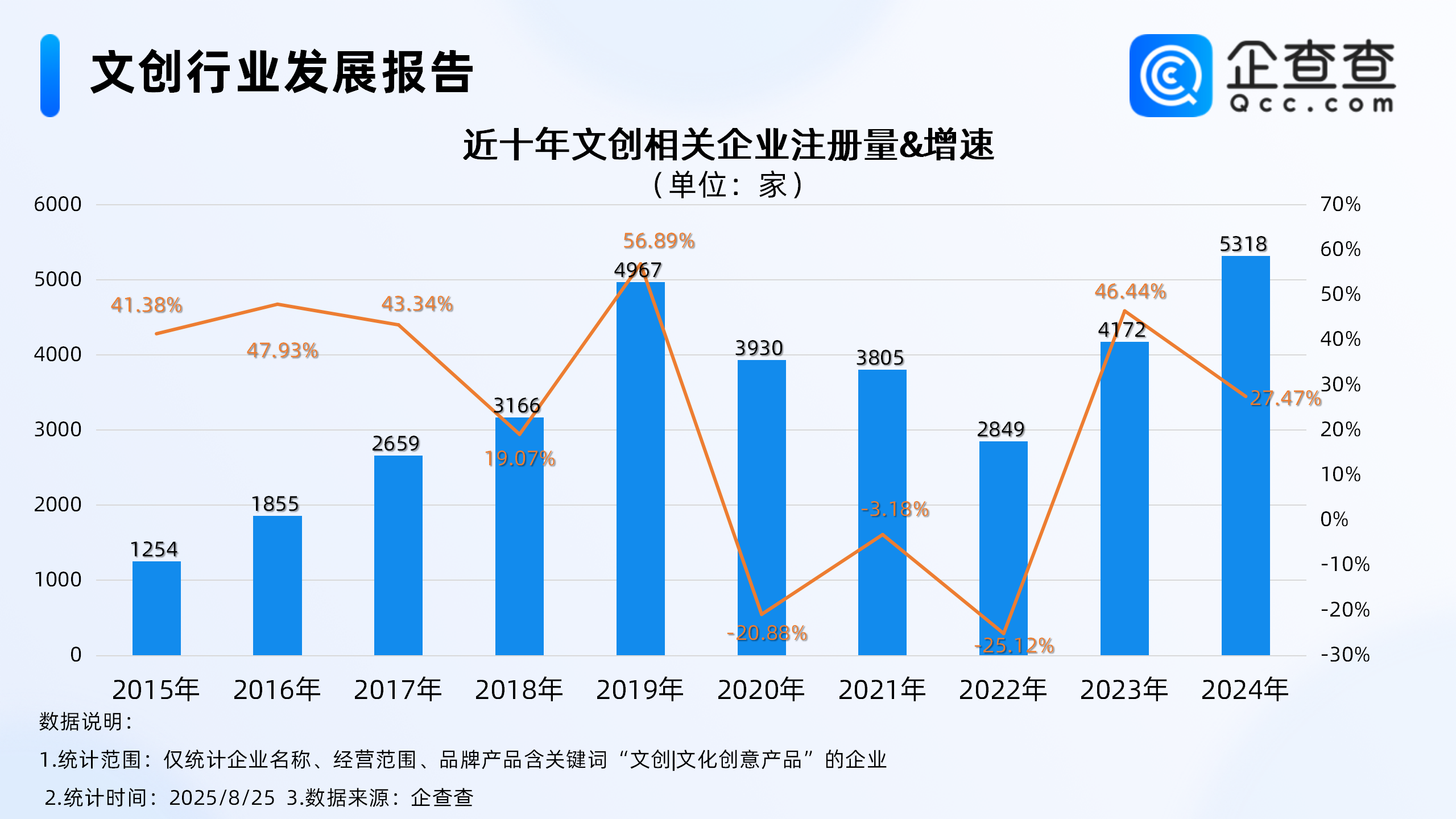 “魯迅同款毛背心”的爆火并非偶然,它映射了當下文創消費的巨大潛力。企查查數據顯示,截至8月下旬,國內文創相關現存企業達3.02萬家,主要分布在華東地區、華南地區。注冊量方面,2024年相關企業注冊量5318家,同比增長27.47%。截至目前今年已注冊4520家,其中前七月注冊量達4080家,同比增長39.73%。