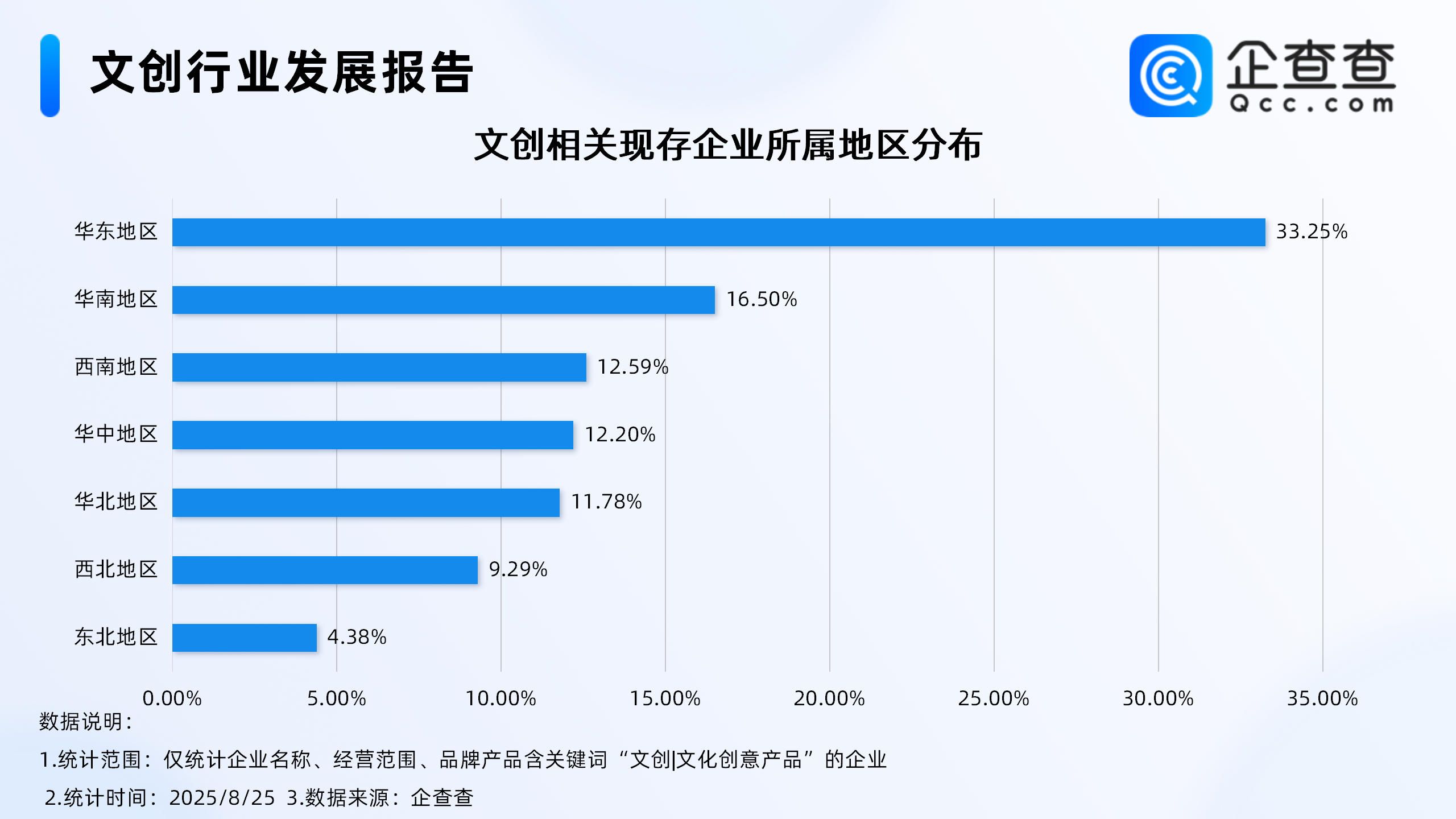 企查查數據顯示,截至8月下旬,國內文創相關現存企業達3.02萬家,主要分布在華東地區,占比達33.25%,其次為分布在華南地區的相關企業,占比達16.5%。分布在西南地區、華中地區、華北地區的相關企業,在全國存量占比均在11%-13%之間。