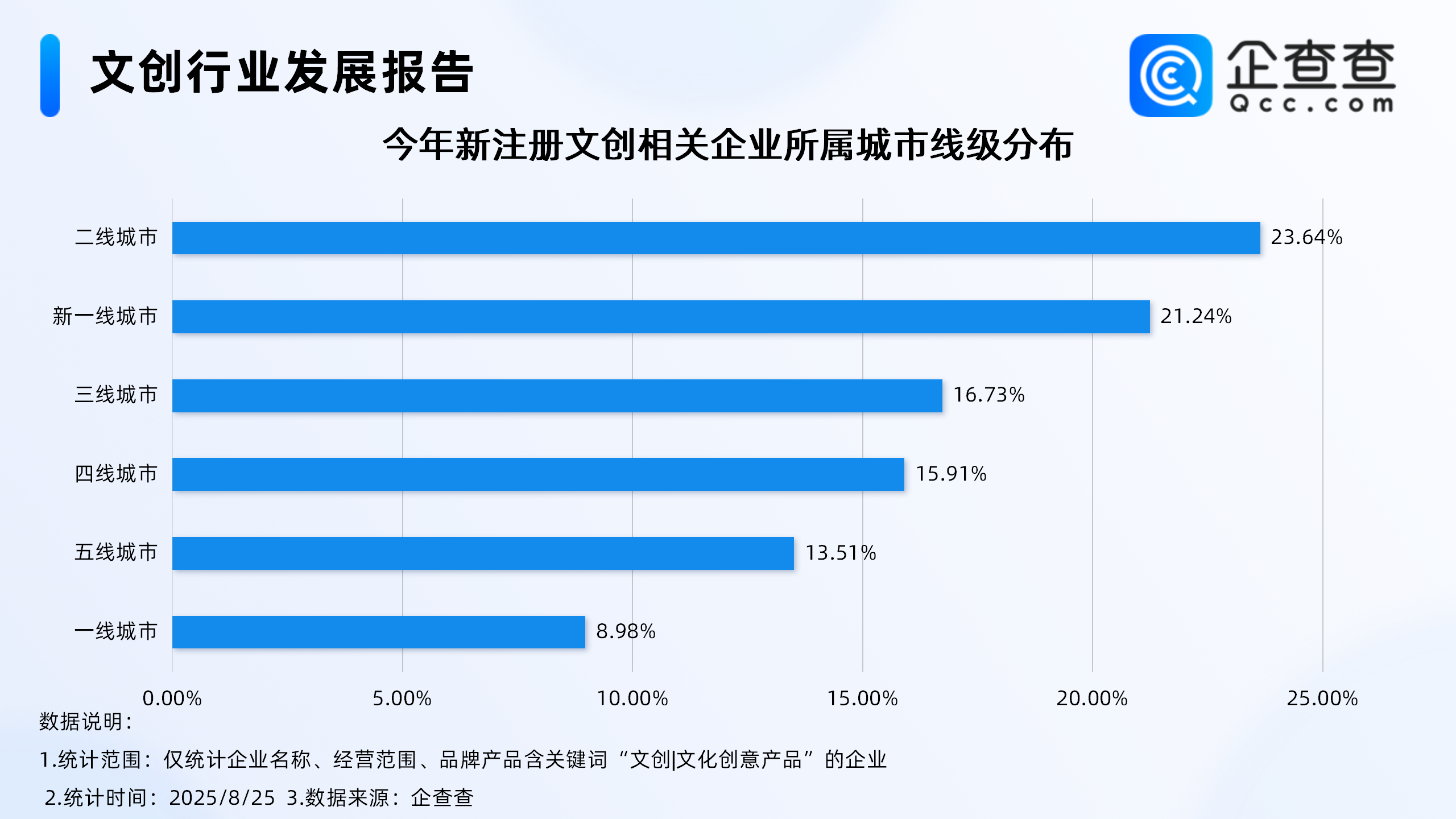 企查查數據顯示,今年新注冊的文創相關企業多分布在二線城市、新一線城市,分別占比23.64%、21.64%。