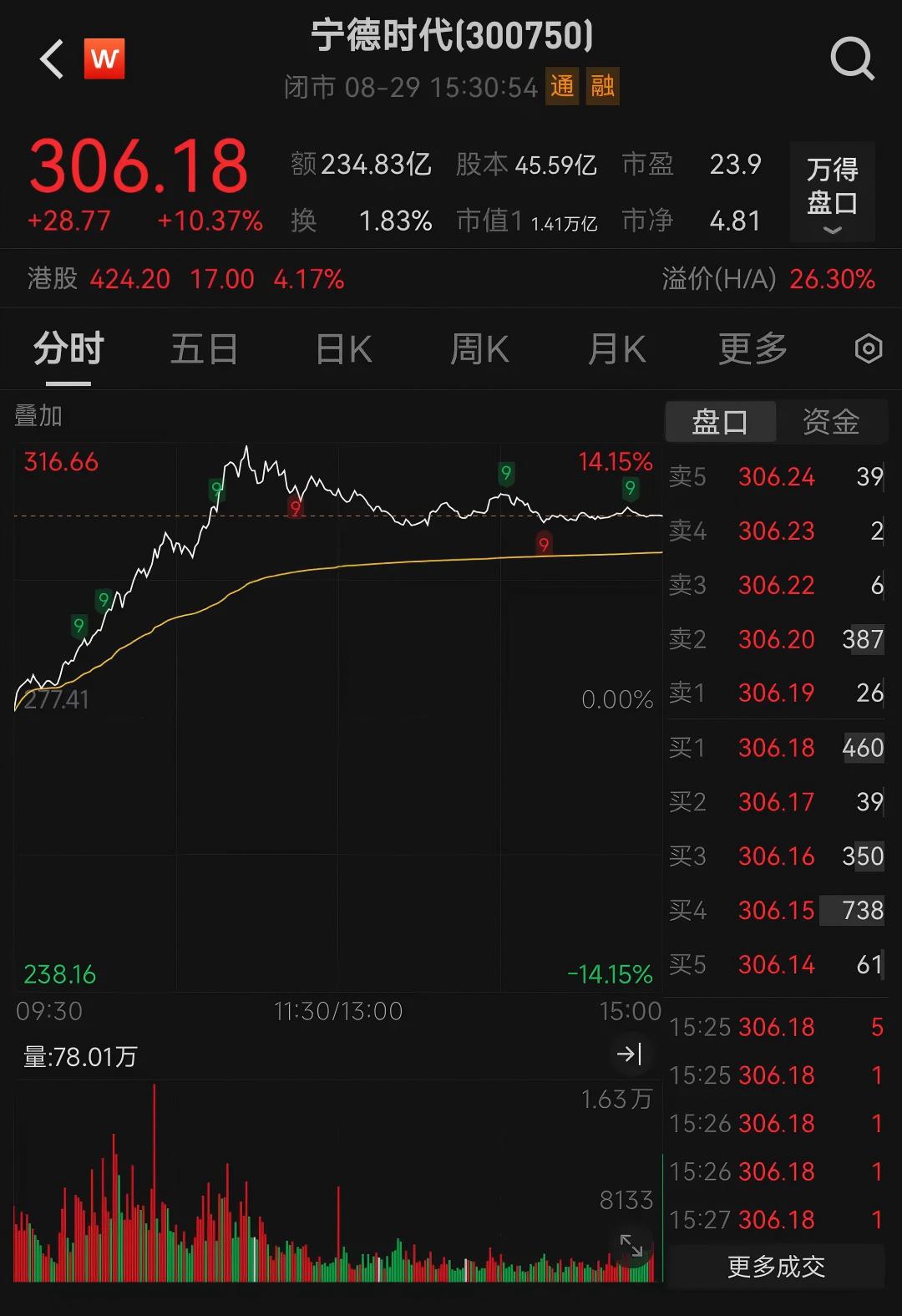 今日,鋰電板塊全面爆發,板塊內掀起漲停潮,逾200只個股飄紅。先導智能、捷邦科技、杭可科技紛紛實現“20CM”漲停,德瑞鋰電、中科電氣、貝特瑞等領漲。臨近午盤,寧德時代(300750)強勢拉升,一度上漲14%,公司股價收盤時重回300元/股上方,當日成交額為234.83億元。
