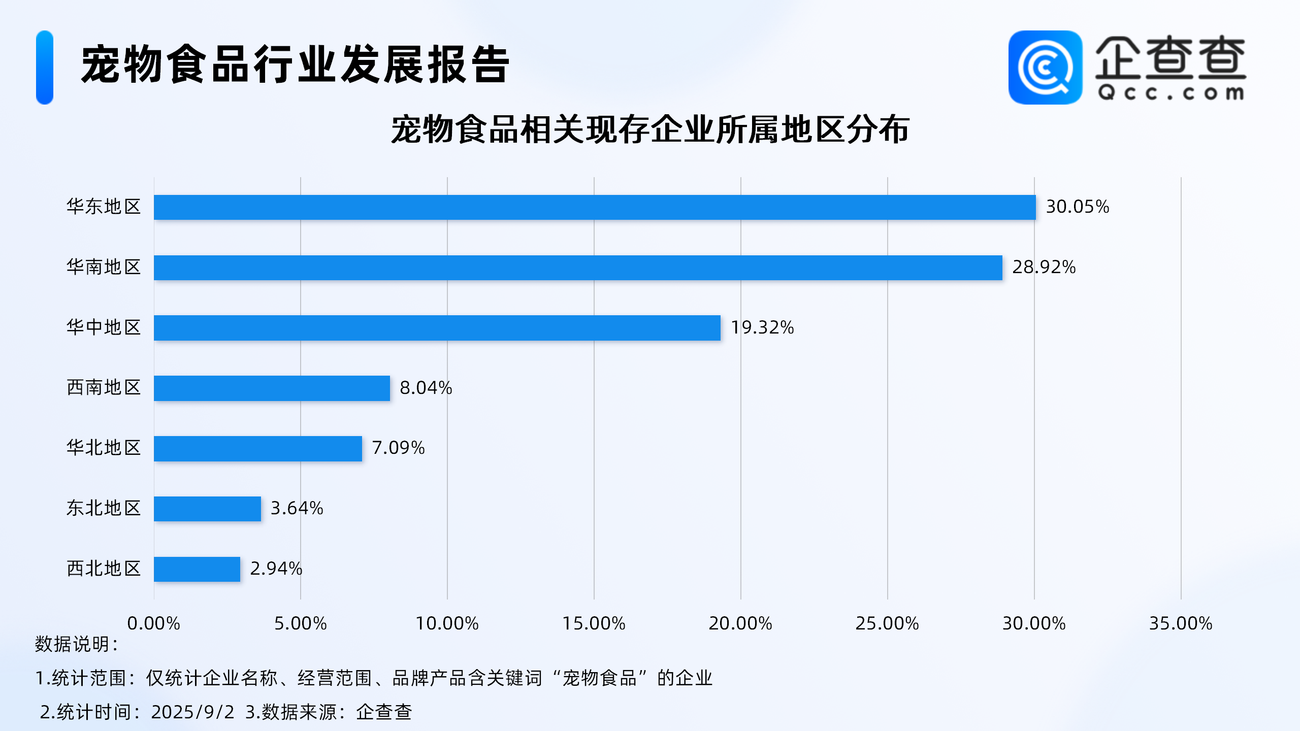 企查查數(shù)據(jù)顯示,截至9月初,國內寵物食品相關現(xiàn)存企業(yè)達454.6萬家,主要分布在華東地區(qū)、華南地區(qū),分別占比30.5%、28.92%。其次為華中地區(qū),占比達19.32%。從成立年限來看,近8成寵物食品相關企業(yè)成立于近三年,其中成立年限在1-3年的相關企業(yè)最多,占比達46.29%。