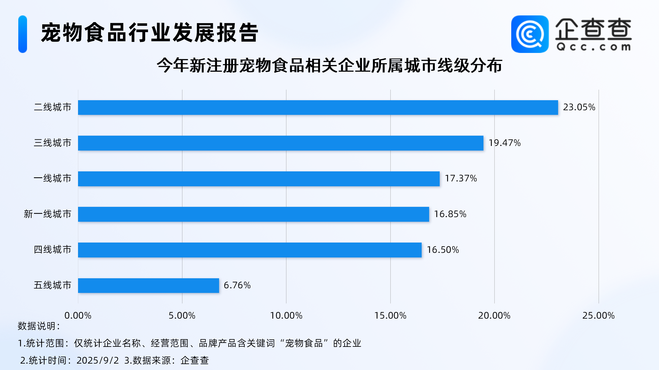 企查查數(shù)據(jù)顯示,城市線級分布方面,今年新注冊的寵物食品相關企業(yè)主要分布在二線城市,占比達23.05%,其次為三線城市、一線城市、分別占比19.47%、17.37%。