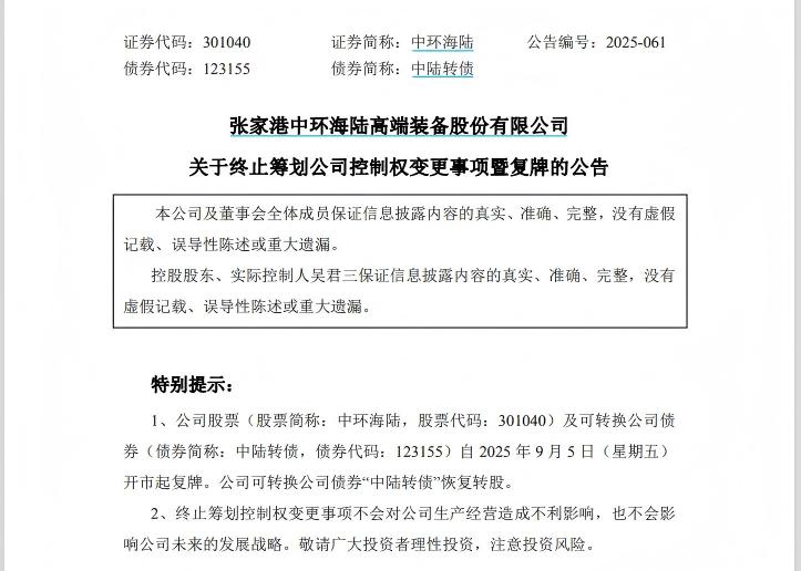 昨日晚間,中環(huán)海陸發(fā)布公告稱,因公司控股股東、實(shí)際控制人吳君三與交易對(duì)方就公司未來發(fā)展安排未達(dá)成一致意見,經(jīng)相關(guān)方協(xié)商一致,決定終止本次控制權(quán)變更事項(xiàng)。公司股票及可轉(zhuǎn)債于2025年9月5日復(fù)牌。