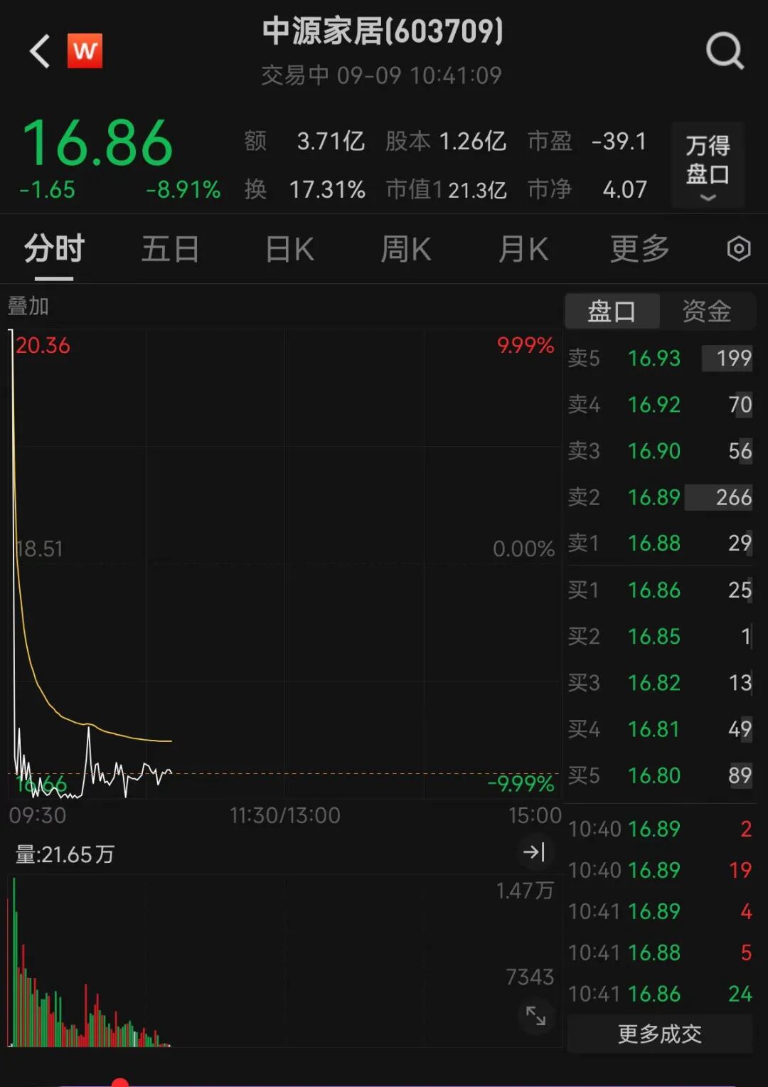 截至發(fā)稿時(shí),中源家居股價(jià)暫報(bào)16.86元/股,下跌8.91%。