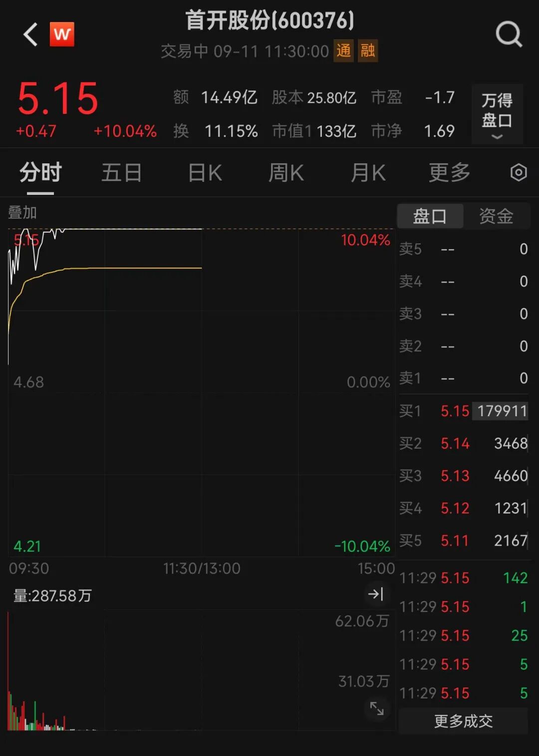 連板股方面,因11連板的天普股份今日停牌核查,此前已斬獲6個漲停板的首開股份成為當前市場連板次數(shù)最多的股票。該股高開后一路震蕩上行封住漲停,截至午盤,買一封單近18萬手,報5.15元/股。