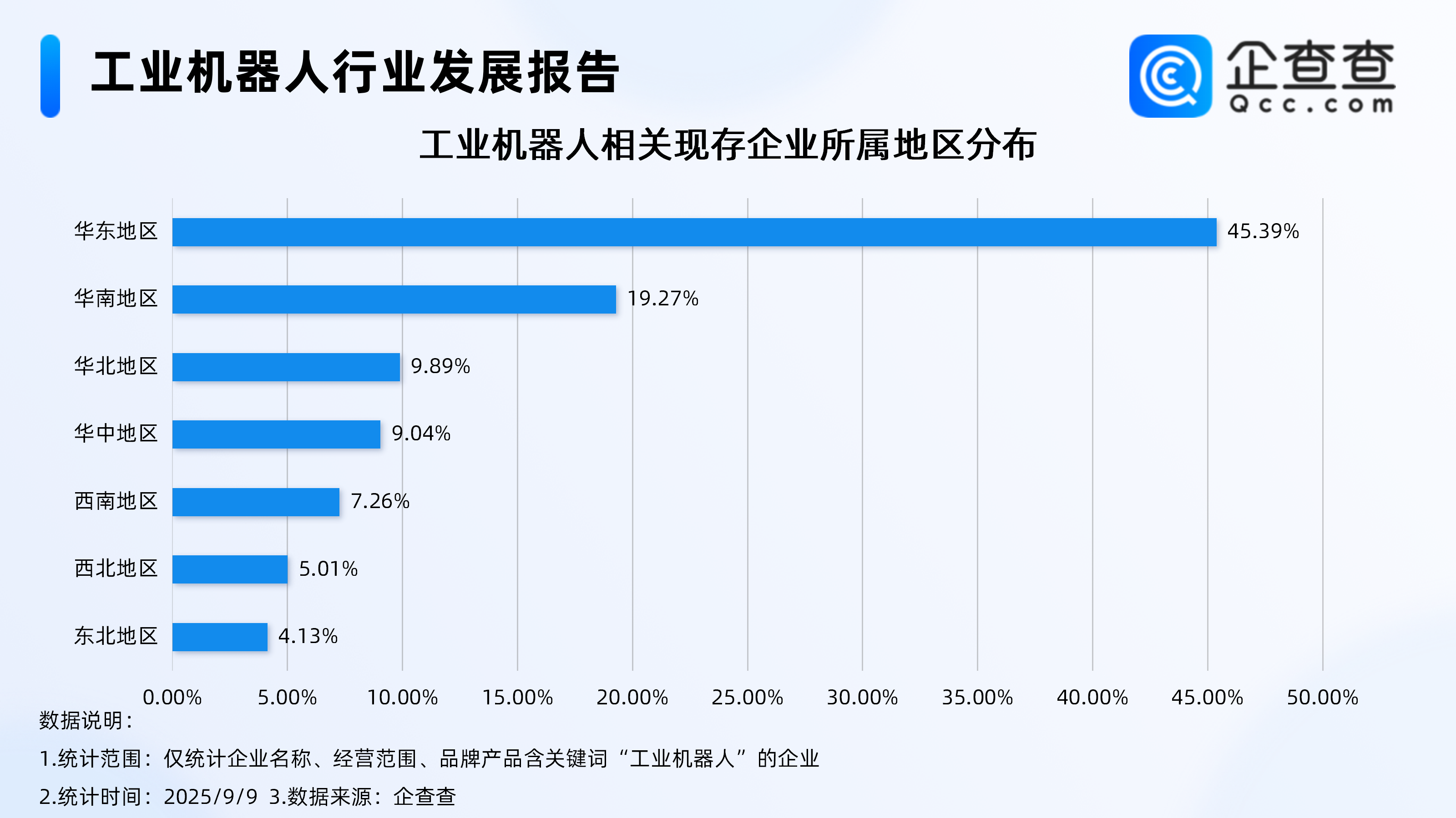 企查查數(shù)據(jù)顯示,截至9月9日,國(guó)內(nèi)工業(yè)機(jī)器人相關(guān)企業(yè)現(xiàn)存量達(dá)37.97萬(wàn)家,主要分布在華東地區(qū),占比達(dá)45.39%。其次為華南地區(qū),占比達(dá)19.27%,分布于華北地區(qū)、華中地區(qū)的相關(guān)企業(yè)均占比超9%。