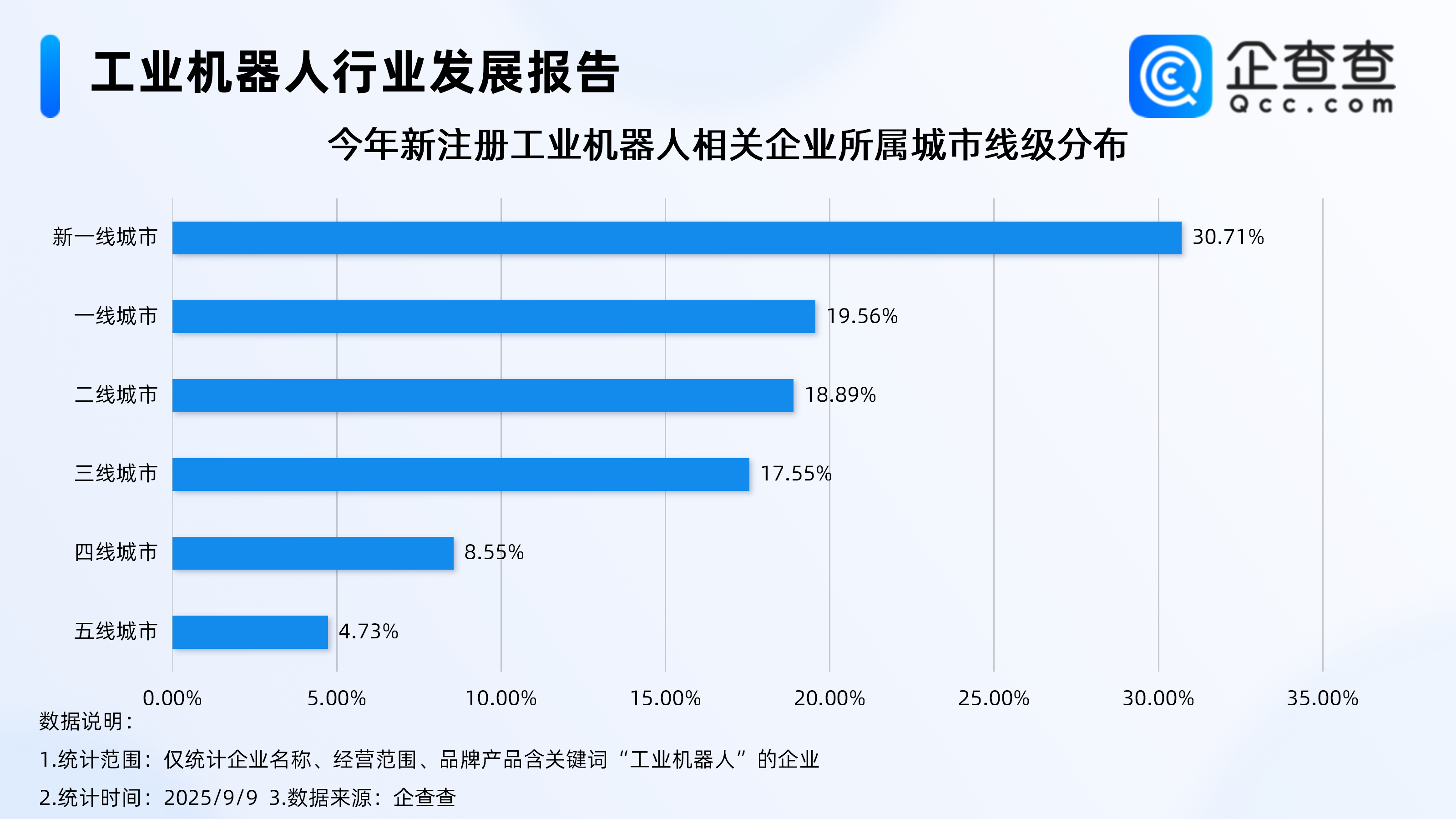 企查查數(shù)據(jù)顯示,從城市線級(jí)分布來(lái)看,今年以來(lái)新注冊(cè)的工業(yè)機(jī)器人相關(guān)企業(yè),多集中分布在新一線城市,占比達(dá)30.71%,其次為一線城市、二線城市,分別占比19.56%、18.89%。