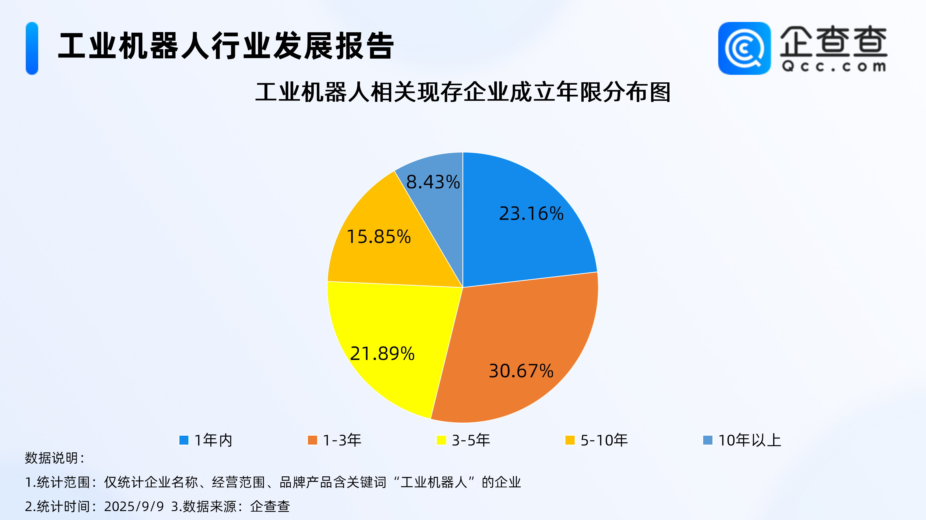 企查查數(shù)據(jù)顯示,從成立年限來(lái)看,國(guó)內(nèi)工業(yè)機(jī)器人相關(guān)現(xiàn)存企業(yè)中,超5成相關(guān)企業(yè)成立于近三年,其中成立年限在1-3年的相關(guān)企業(yè)最多,占比達(dá)30.67%,成立于1年內(nèi)的相關(guān)企業(yè)占比達(dá)23.16%。