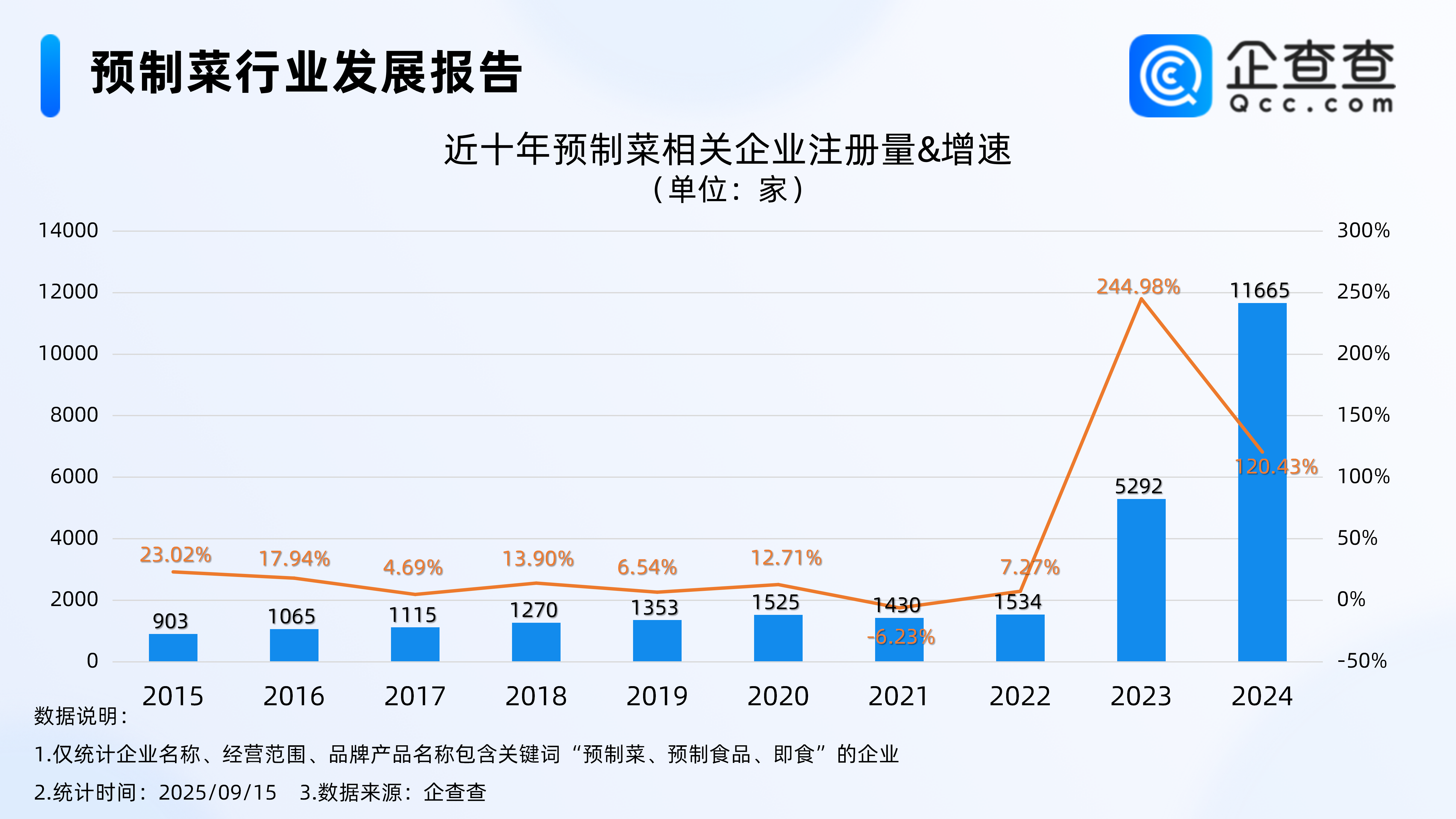 企查查數(shù)據(jù)顯示,國內(nèi)現(xiàn)存預(yù)制菜相關(guān)企業(yè)2.8萬家,近十年相關(guān)企業(yè)注冊量呈整體增長態(tài)勢,2023年全年注冊5292家相關(guān)企業(yè),同比增長244.98%,達(dá)近十年注冊量增速峰值。2024年全年注冊量首次突破萬家,達(dá)1.17萬家,同比增長120.43%,達(dá)近十年注冊量峰值。