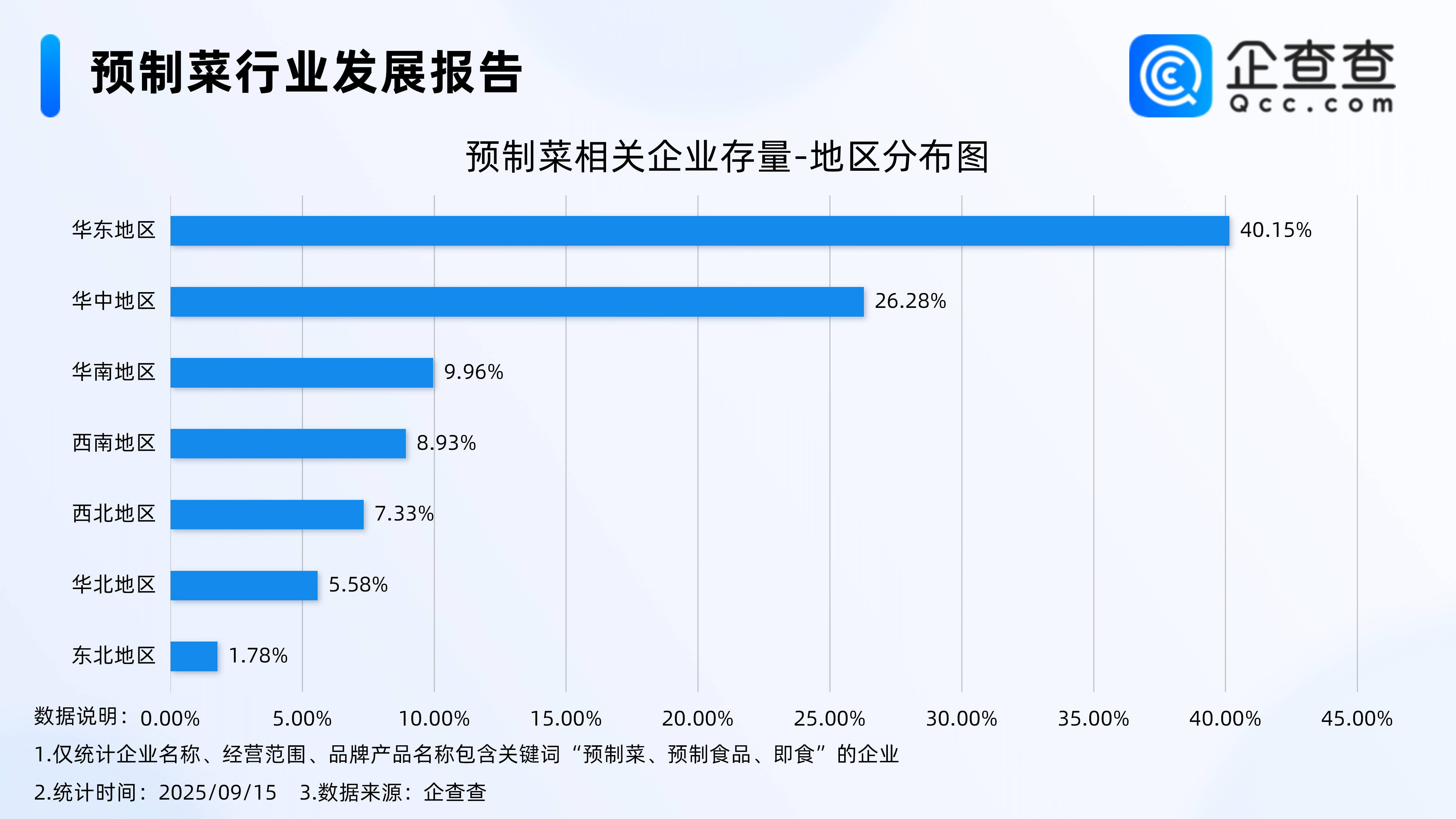 企查查數(shù)據(jù)顯示,從地區(qū)分布來看,預(yù)制菜相關(guān)企業(yè)主要集中分布在華東地區(qū),占比達(dá)40.15%。其次,分布在華中地區(qū)的相關(guān)企業(yè)占比26.28%。分布在華南、西南等地區(qū)的相關(guān)企業(yè)占比均不足10%。