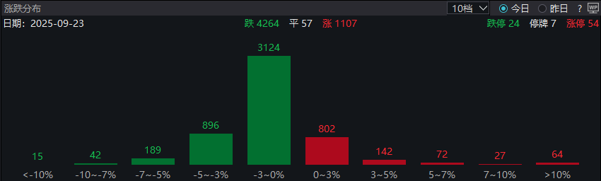 Wind數據顯示,今日4264只個股飄綠,1107只個股上漲,漲停家數54家,跌停家數24家。全市場個股中位數下跌1.6%。