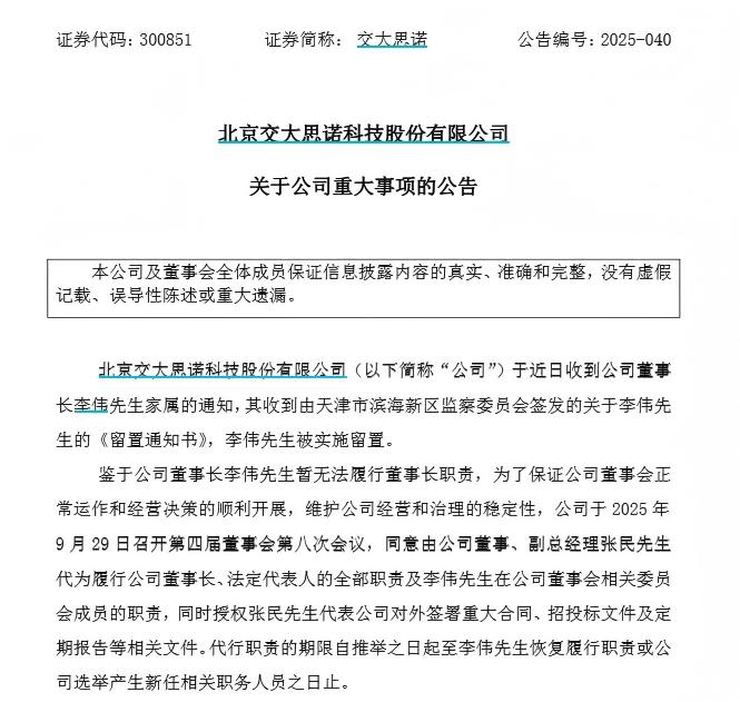 突發!交大思諾,董事長被留置