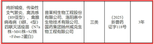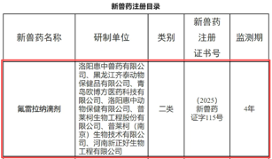 根據《獸藥管理條例》和《獸藥注冊辦法》規定,經農業農村部審查,批準“氟雷拉納滴劑”與“雞新城疫、傳染性支氣管炎、禽流感(H9亞型)、禽腺病毒病(I群,4型)四聯滅活疫苗(N7a株+M41株+SZ株+Fiber-2蛋白)”為新獸藥,并于2025年10月11日公示了核發《新獸藥注冊證書》(中華人民共和國農業農村部公告第957號)“(2025)新獸藥證字115號”、《新獸藥注冊證書》(中華人民共和國農業農村部公告第957號)“(2025)新獸藥證字118號”事項。