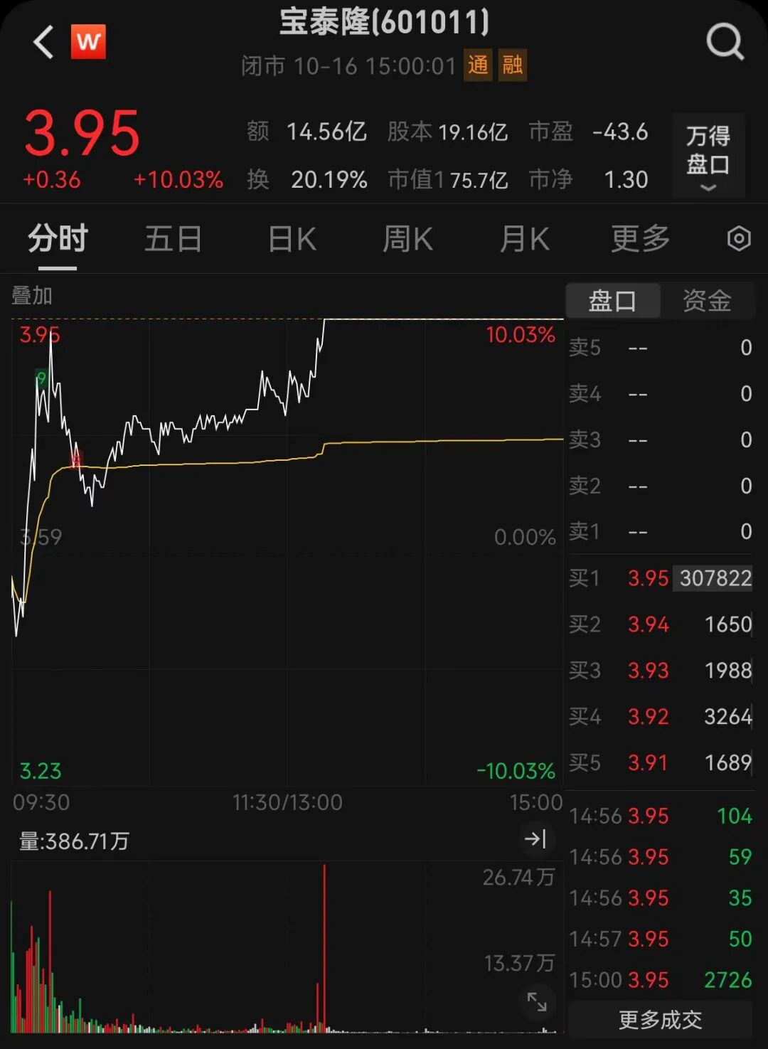 受益于煤炭板塊的強勢上攻,昨日收出巨量長陰的寶泰隆(601011)今日小幅低開后快速翻紅,并于午后強勢封板,走出5天4板,5個交易日累計上漲33%。