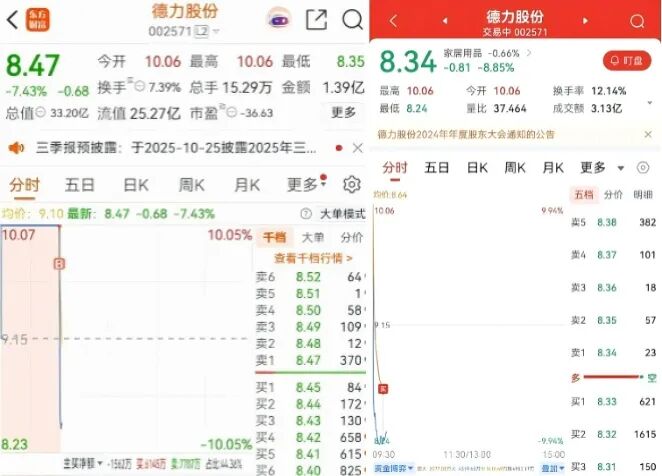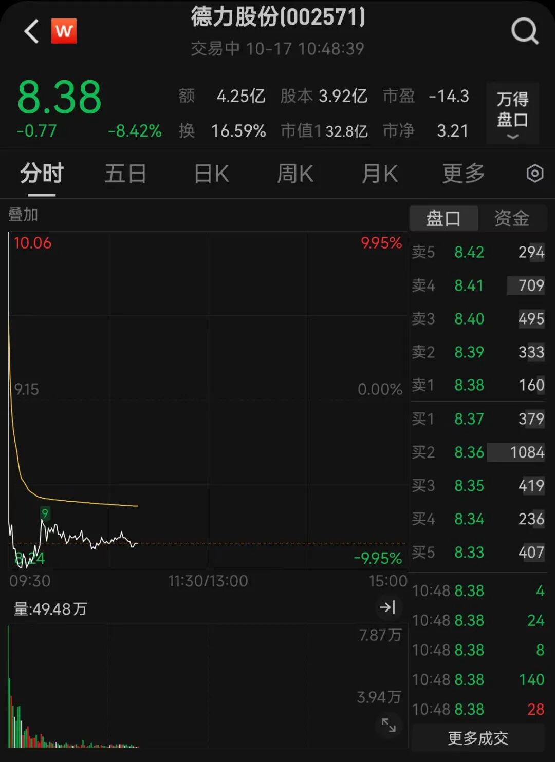 17日早盤,德力股份以離漲停價僅差1分錢的10.06元/股開盤,但隨即調頭向下,盤中一度觸及跌停,上演“準天地板”。截至發稿時,該股報8.38元/股,跌幅8.42%,換手率16.59%。