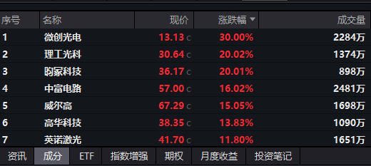 今日,電子元器件板塊表現亮眼,板塊內多只個股沖擊漲停,其中微創光電拿下“30CM”漲停,理工光科、昀冢科技收獲“20CM”漲停。