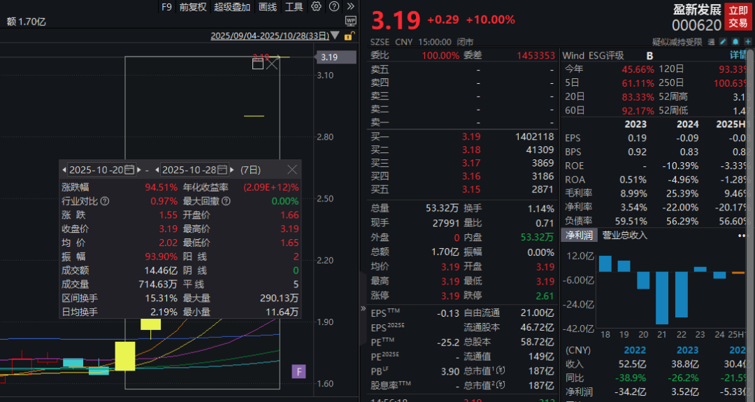 Wind數據顯示,7個交易日內,盈新發展股價累計上漲94.51%,其間Wind同行業(二級行業)指數上漲0.97%。截至28日收盤,該股股價報3.19元/股,換手率僅有1.14%。