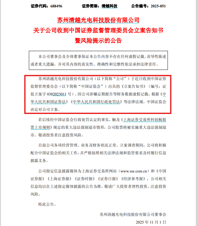 10月31日,清越科技發布公告稱,公司于近日收到中國證監會下發的《立案告知書》。因公司涉嫌定期報告等財務數據虛假記載,中國證監會決定對其立案。