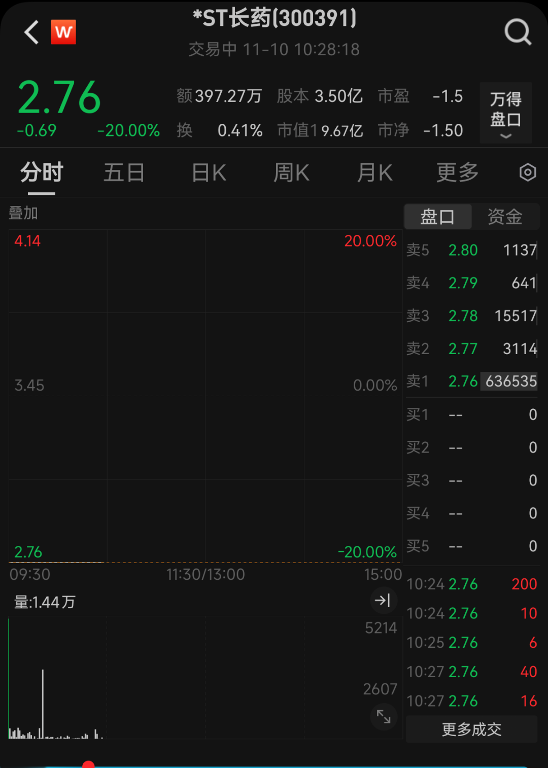 10日,*ST長藥(300391)股價開盤即“20CM”跌停。截至發稿,賣一位置仍有63萬手賣單在排隊。