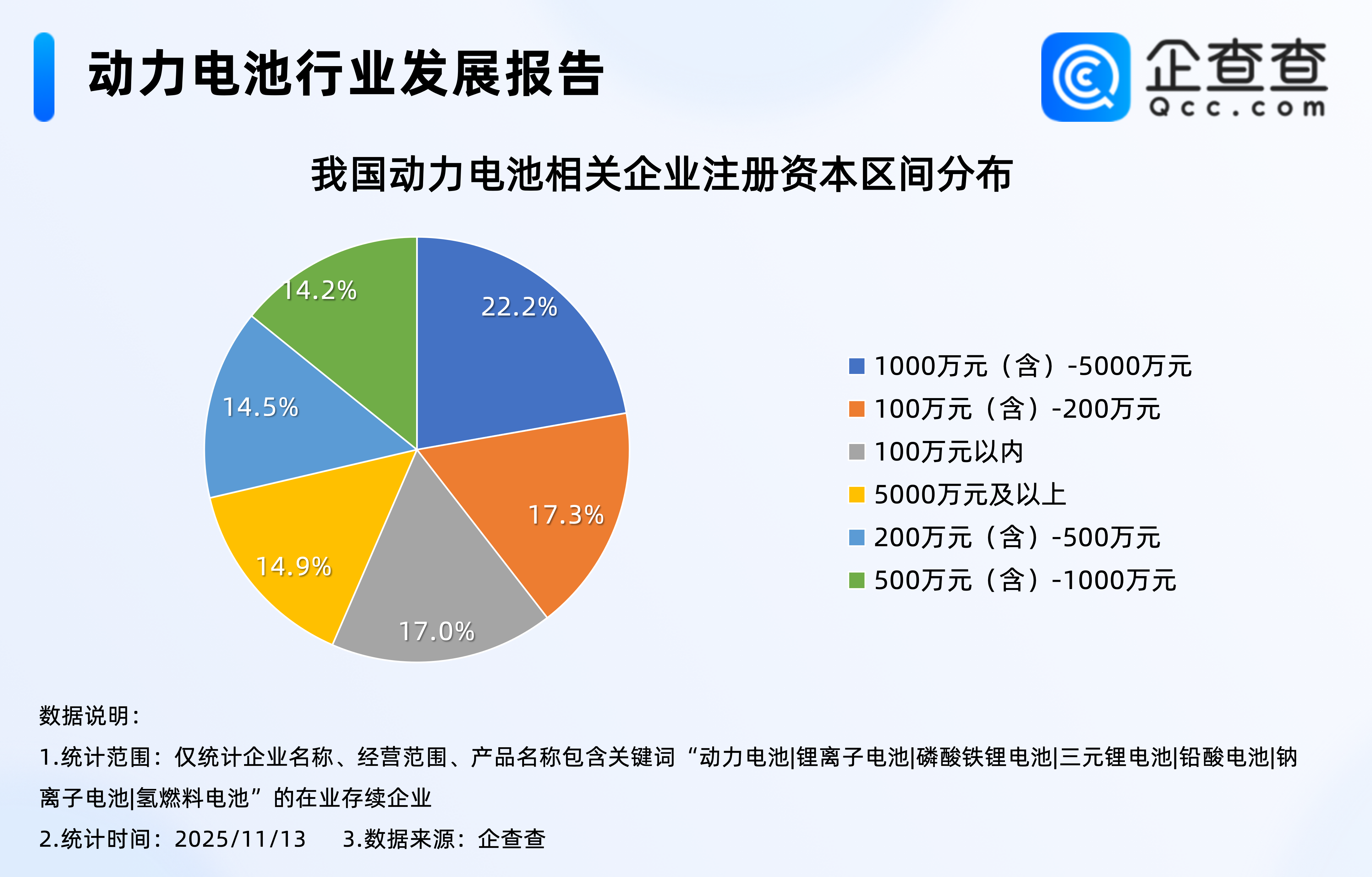 企查查數據顯示,我國動力電池相關企業注冊資本區間分布相對均勻,整體上仍屬于重資本領域,注冊資本超千萬元的企業合計占比37%以上,其中注冊資本在1000萬元至5000萬元之間的企業最多,占比22.2%。