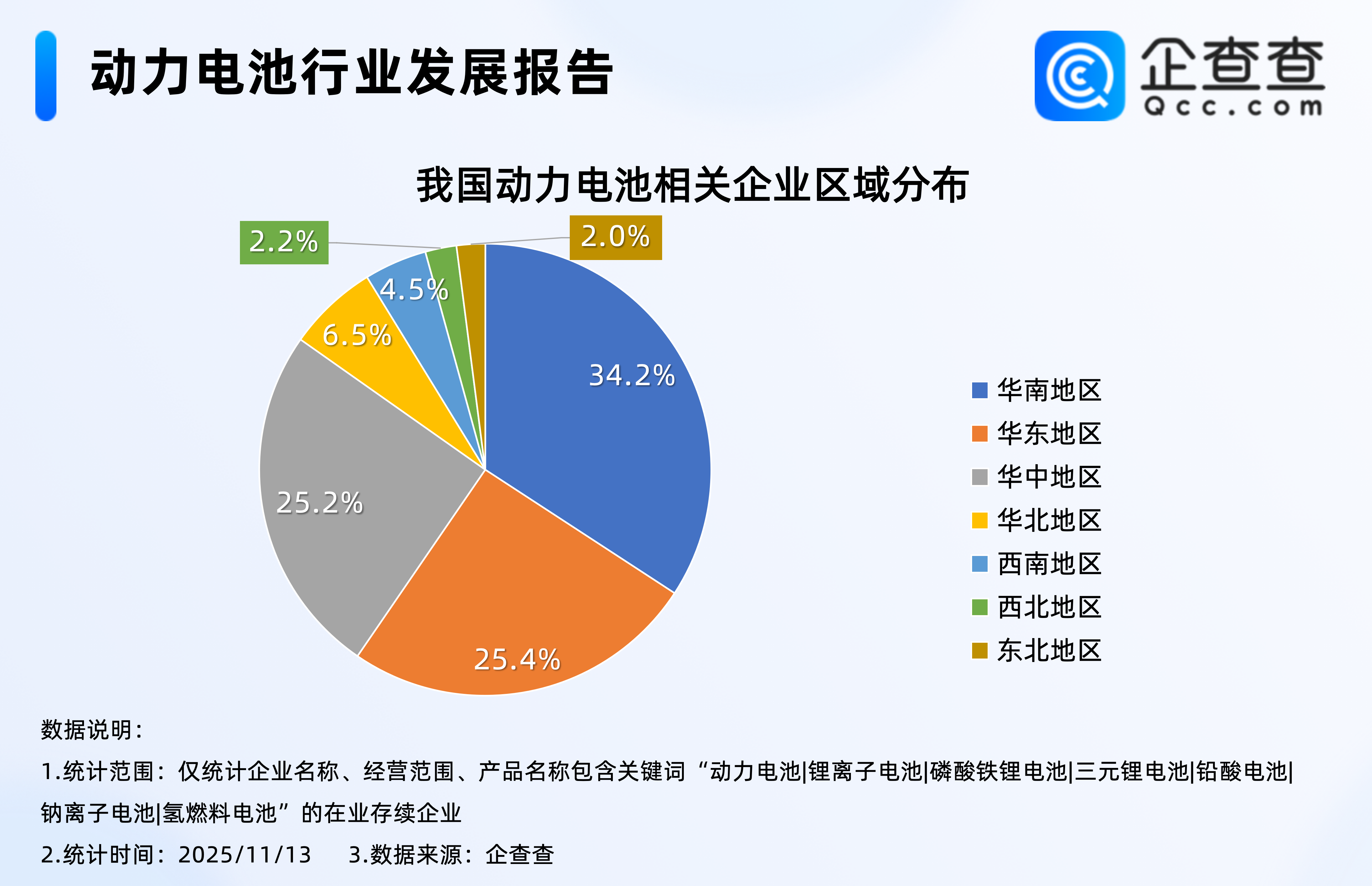 企查查數據顯示,截至11月13日,我國現存1.36萬家動力電池相關企業,區域分布上,華南地區最多,占比34.2%,其次是華東、華中地區,分占25.4%、25.2%,東北地區相對最少,占比2.0%。