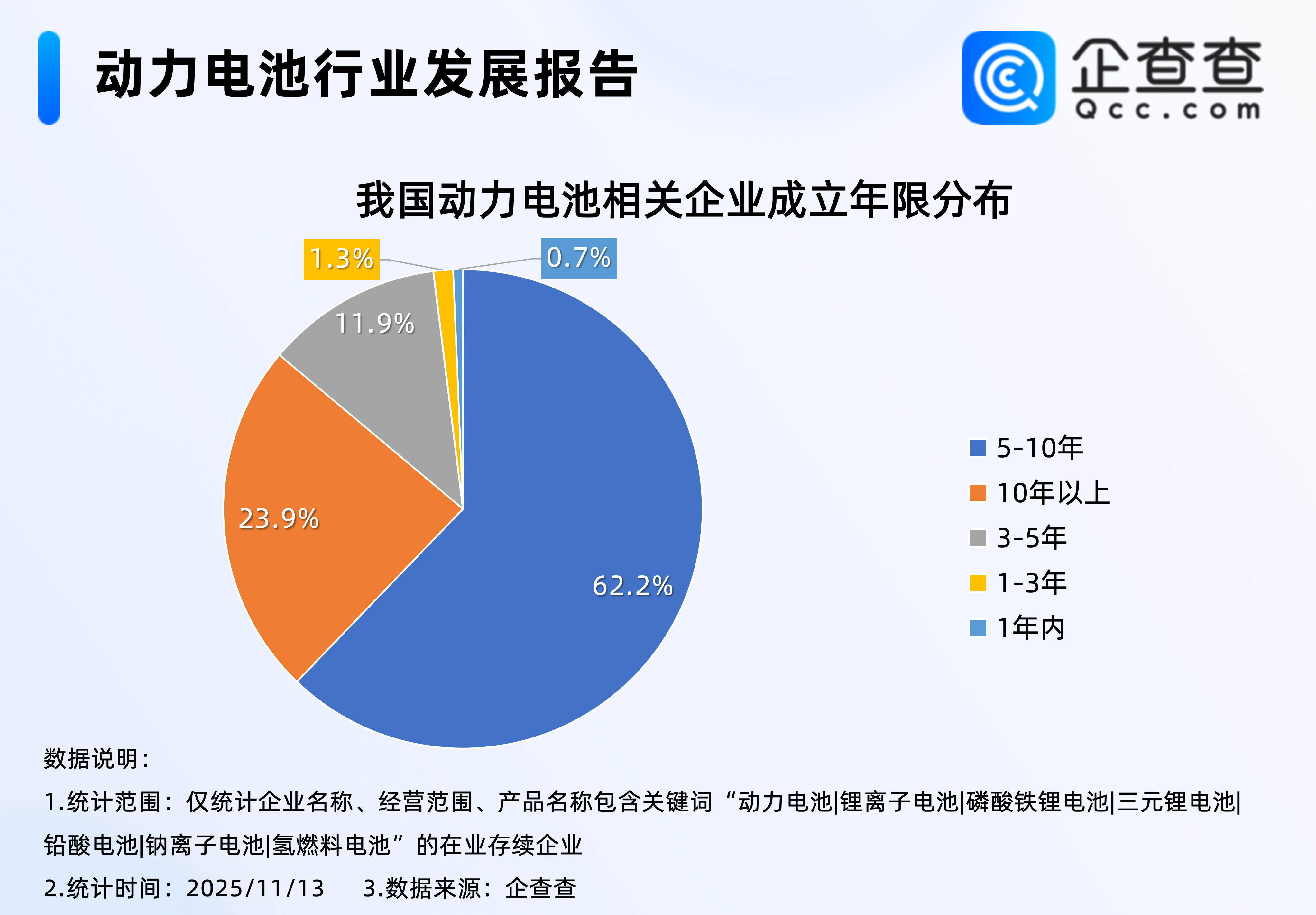企查查數據顯示,從成立年限上看,我國動力電池領域以老牌企業為主,成立年限超5年的企業占比86.1%,其中成立5至10年之間的企業占比超六成。