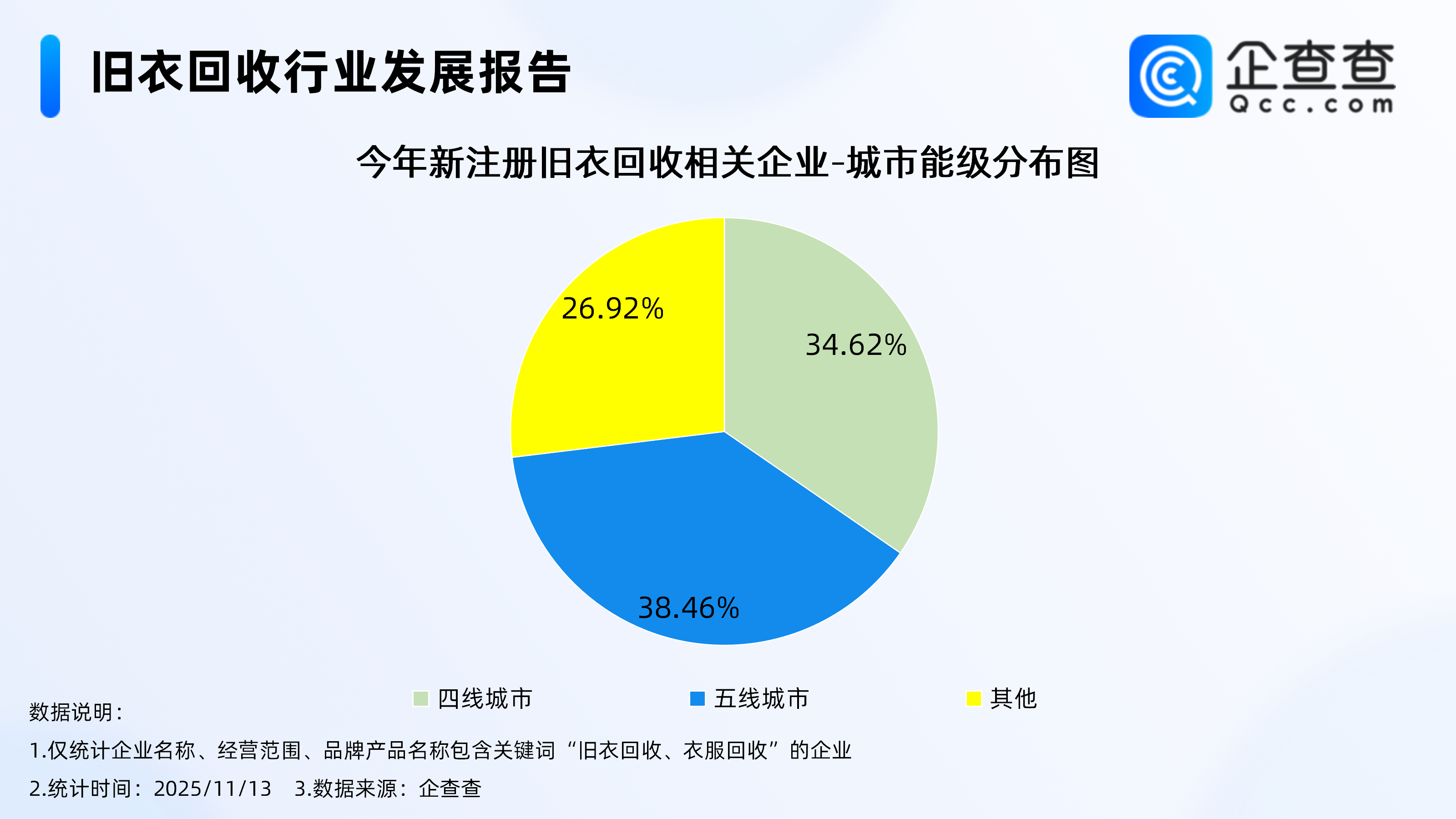 企查查數據顯示,注冊量方面,2024年全年注冊240家相關企業,截至目前,今年已注冊156家。從城市能級分布來看,今年新注冊的舊衣回收相關企業多分布在四、五線城市,其中五線城市貢獻率最高,達38.46%。四線城市貢獻率為34.62%。其他能級城市貢獻率合計占比達26.92%。