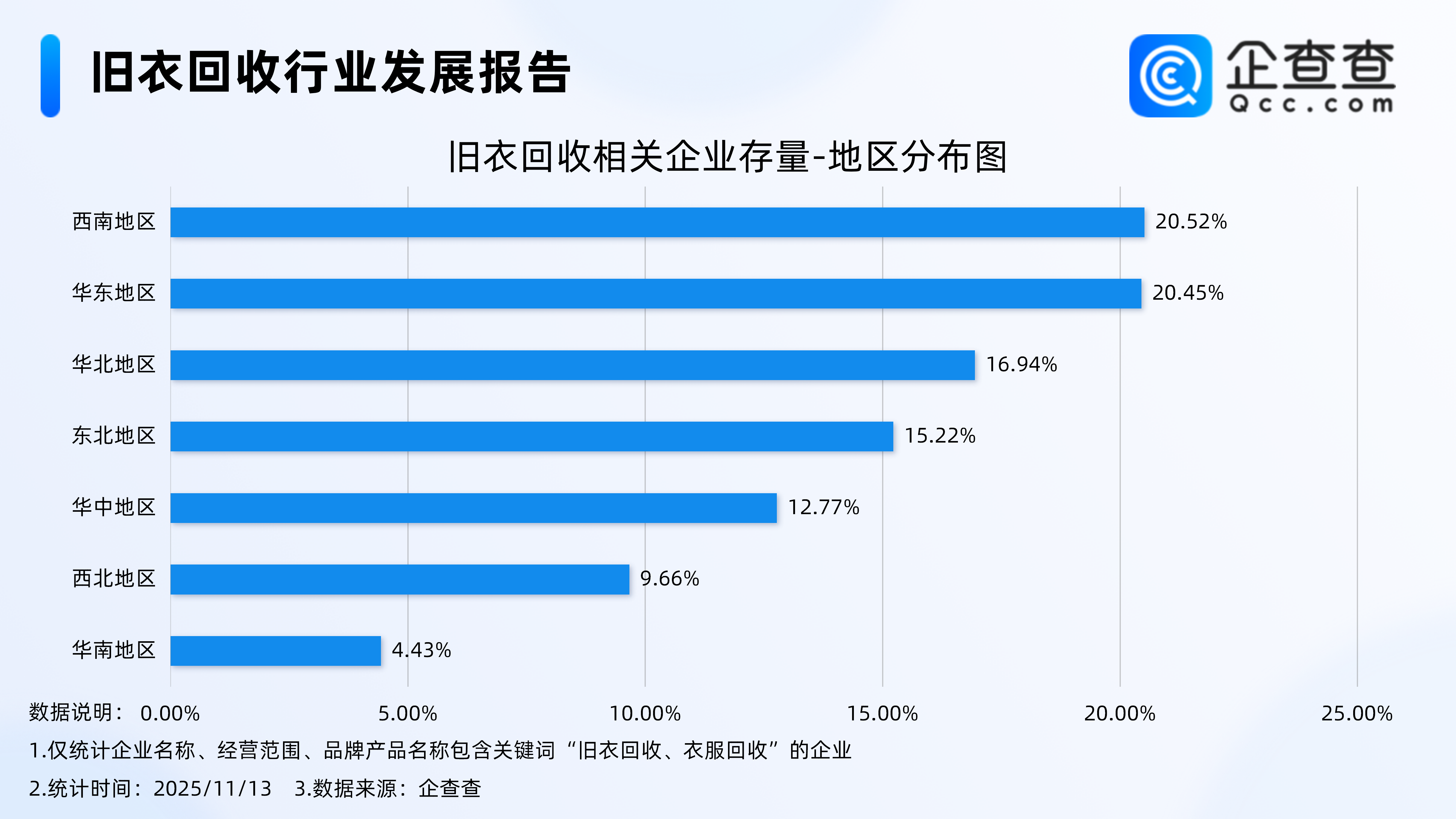 企查查數據顯示,從地區分布來看,舊衣回收相關企業多分布在西南地區、華東地區,分別占比20.52%、20.45%。其次,分布在華北地區、東北地區、華中地區的企業分別占比16.94%、15.22%、12.77%。此外,其余地區占比均不足10%。