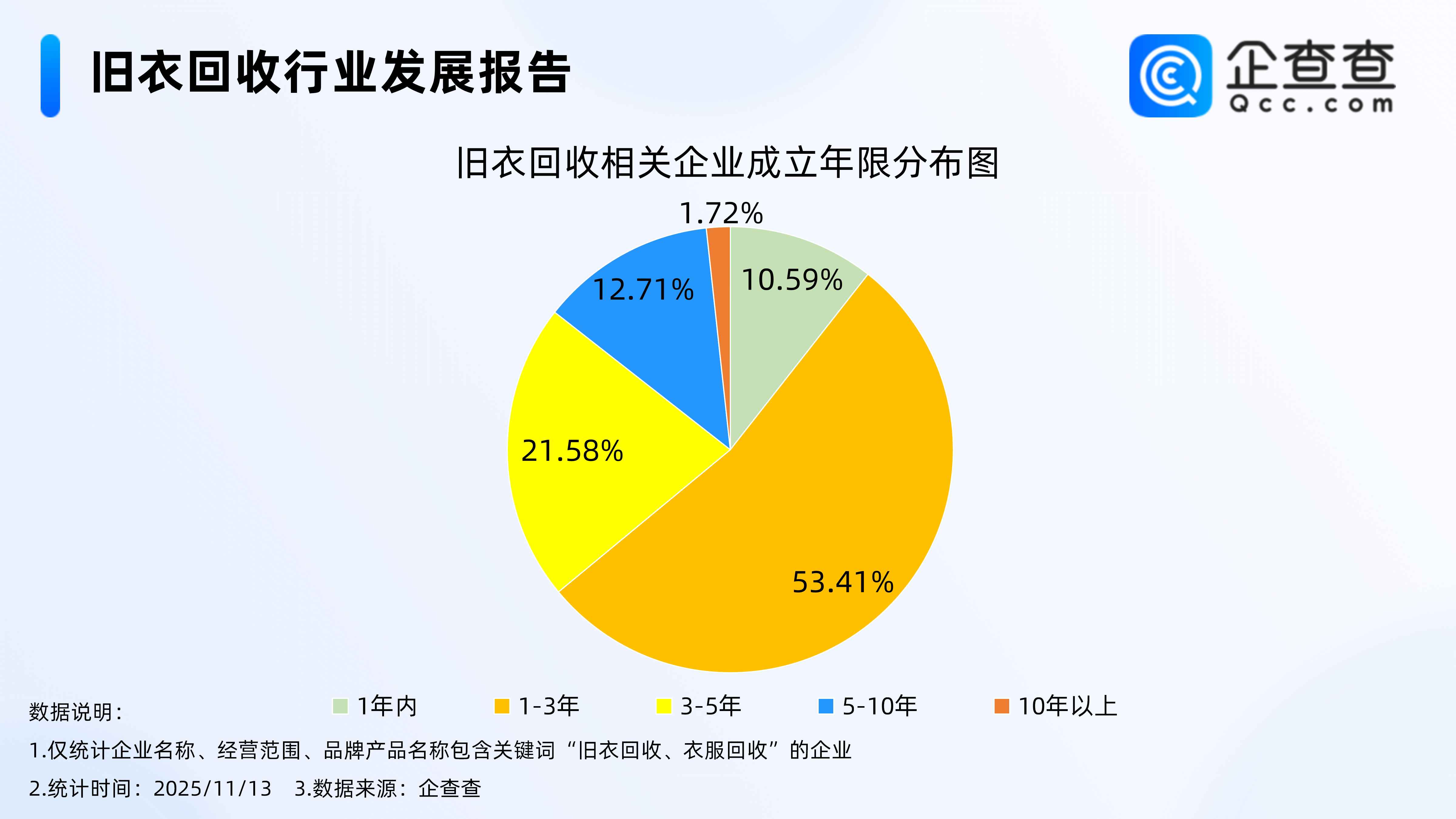 企查查數據顯示,截至11月13日,國內現存1511家舊衣回收相關企業。從經營時間來看,超半數舊衣回收相關企業的成立年限在1-3年,占比達53.41%。其次,成立年限在3-5年、5-10年的相關企業分別占比21.58%、12.71%。