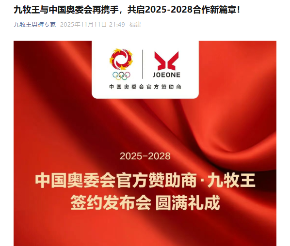 九牧王此輪暴漲行情始于11月12日。當(dāng)日上午,其股價(jià)突然異動(dòng),直線拉升至漲停。市場(chǎng)普遍認(rèn)為,這與前日晚間公司官宣成為“中國(guó)奧委會(huì)官方贊助商”的消息密切相關(guān)。