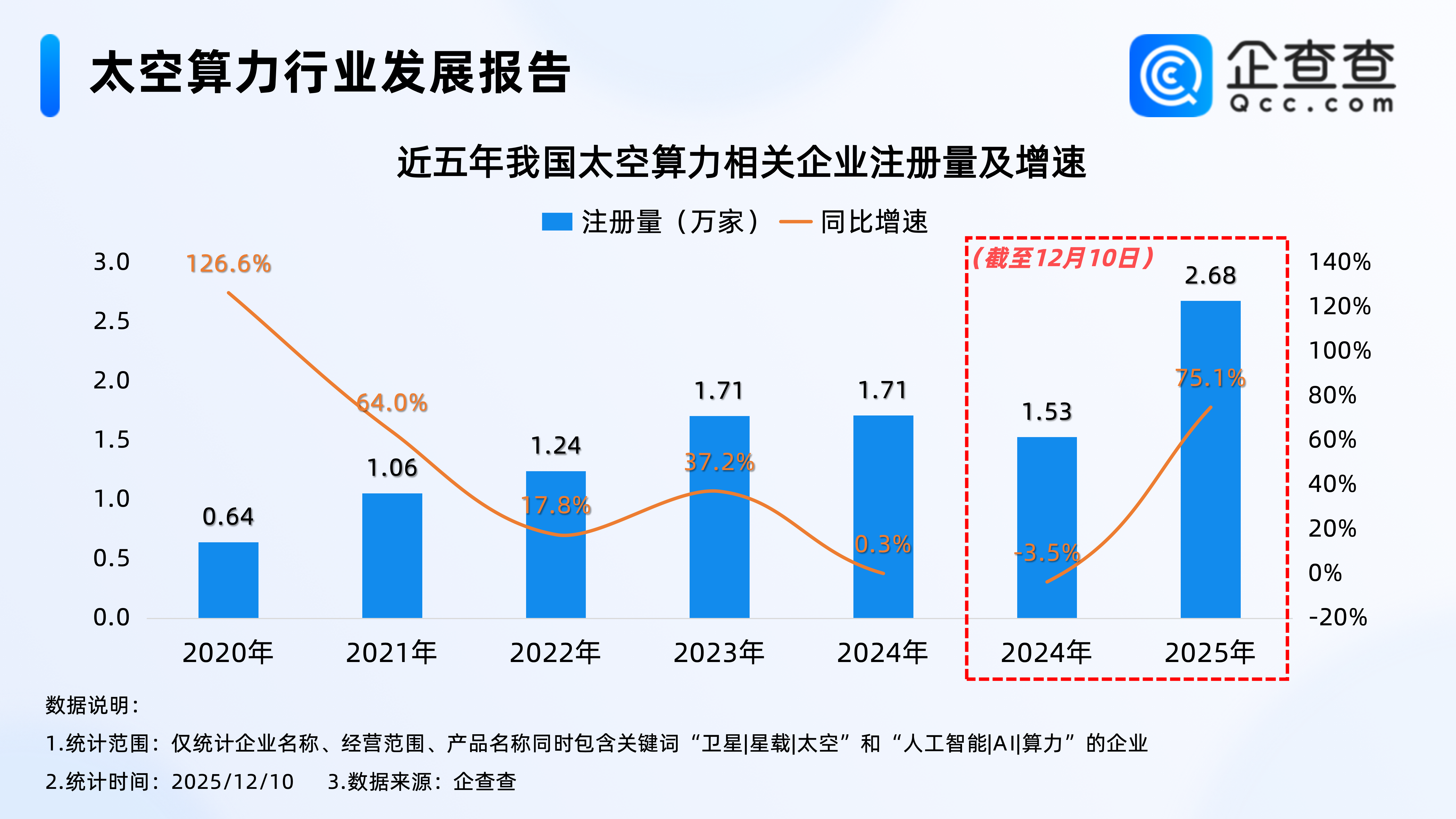 企查查數據顯示,2020年以來,我國太空算力相關企業注冊量基本逐年增加,2024年我國累計注冊1.71萬家太空算力相關企業,達近五年注冊量峰值;截至12月10日,2025年我國已注冊2.68萬家太空算力相關企業,已超2024年全年,相比2024年同期大幅增加75.1%。