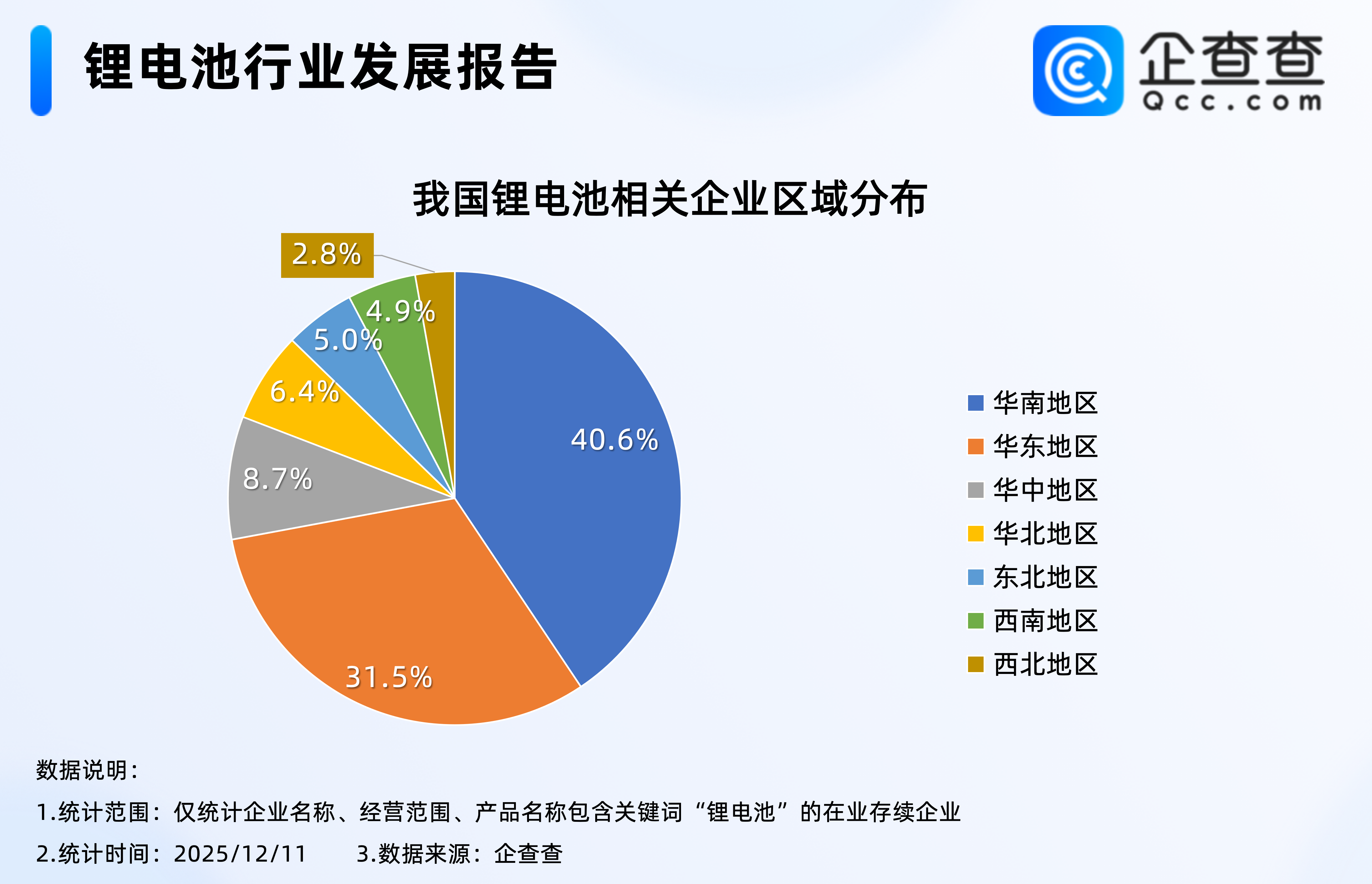 企查查數據顯示,截至12月11日,我國現存1.7萬家鋰電池相關企業,區域分布上,分布在華南地區的相關企業最多,占比40.6%,其次是華東地區,占比31.5%,西北地區相對最少,占比2.8%。