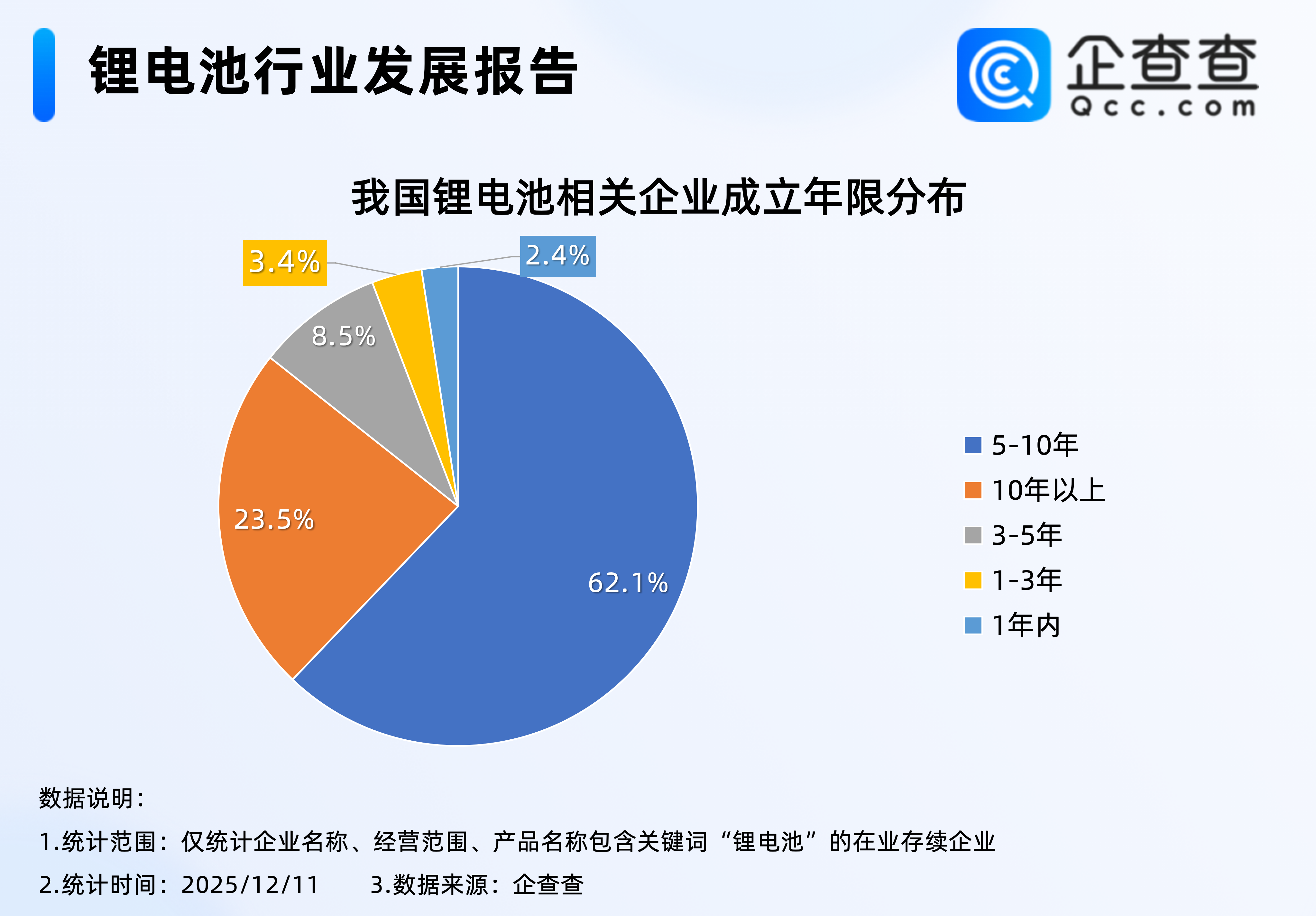 企查查數據顯示,成立年限方面,我國鋰電池領域以老牌企業為主,超八成企業成立5年以上,其中成立10年以上的相關企業占比23.5%。