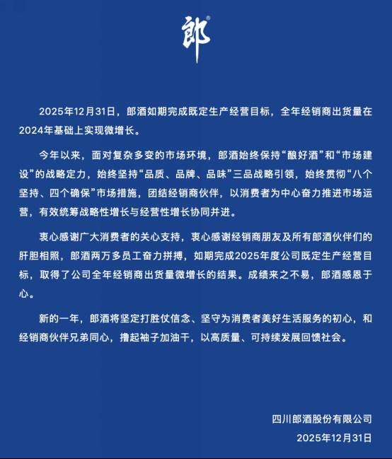 12月31日,郎酒股份公眾號(hào)發(fā)文稱,2025年如期完成既定生產(chǎn)經(jīng)營目標(biāo),全年經(jīng)銷商出貨量在2024年基礎(chǔ)上實(shí)現(xiàn)微增長。